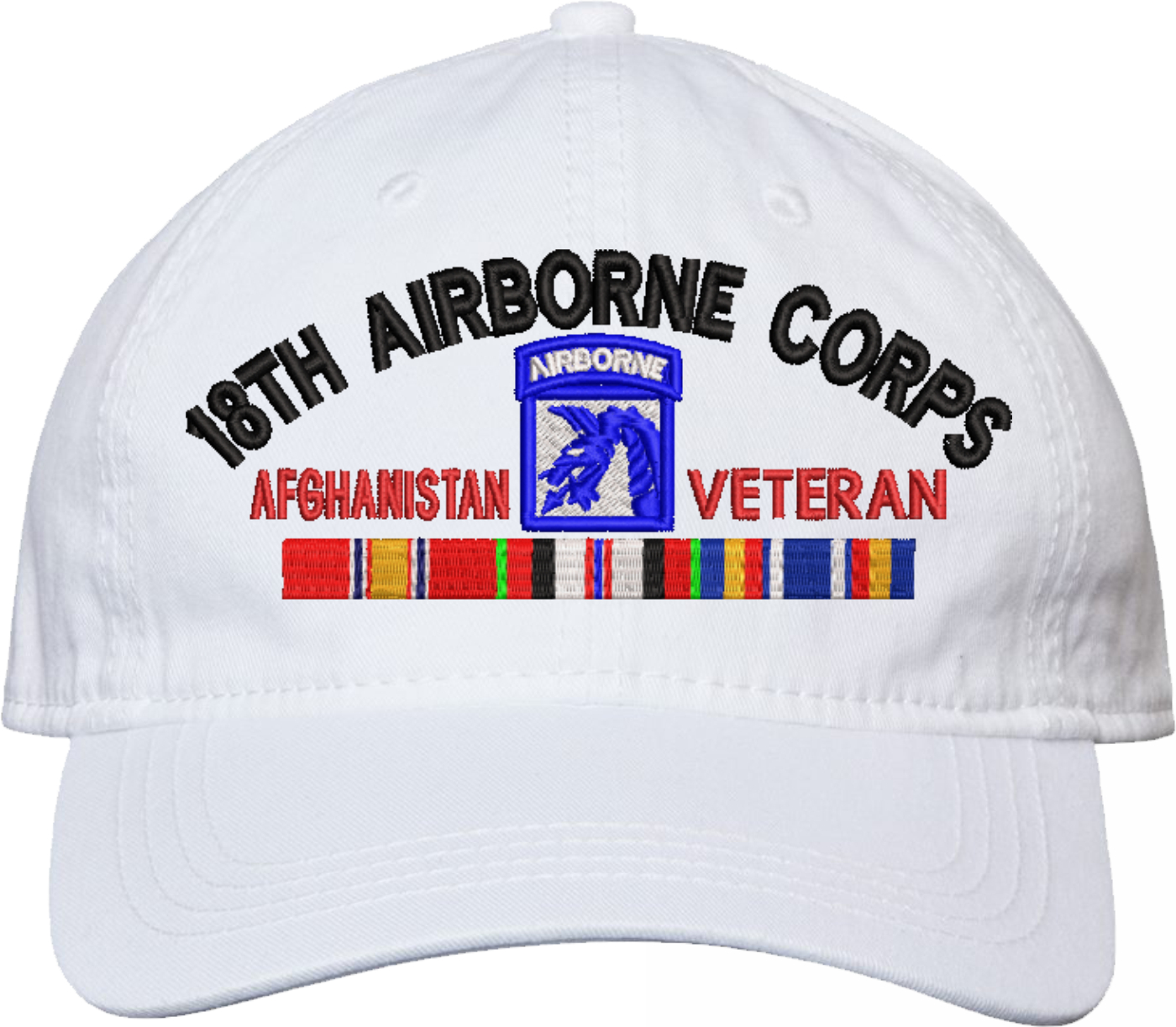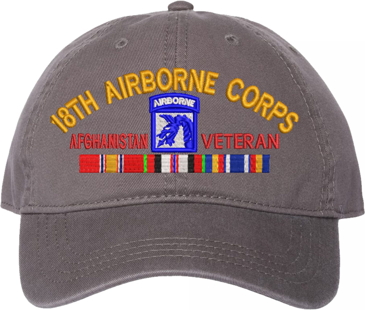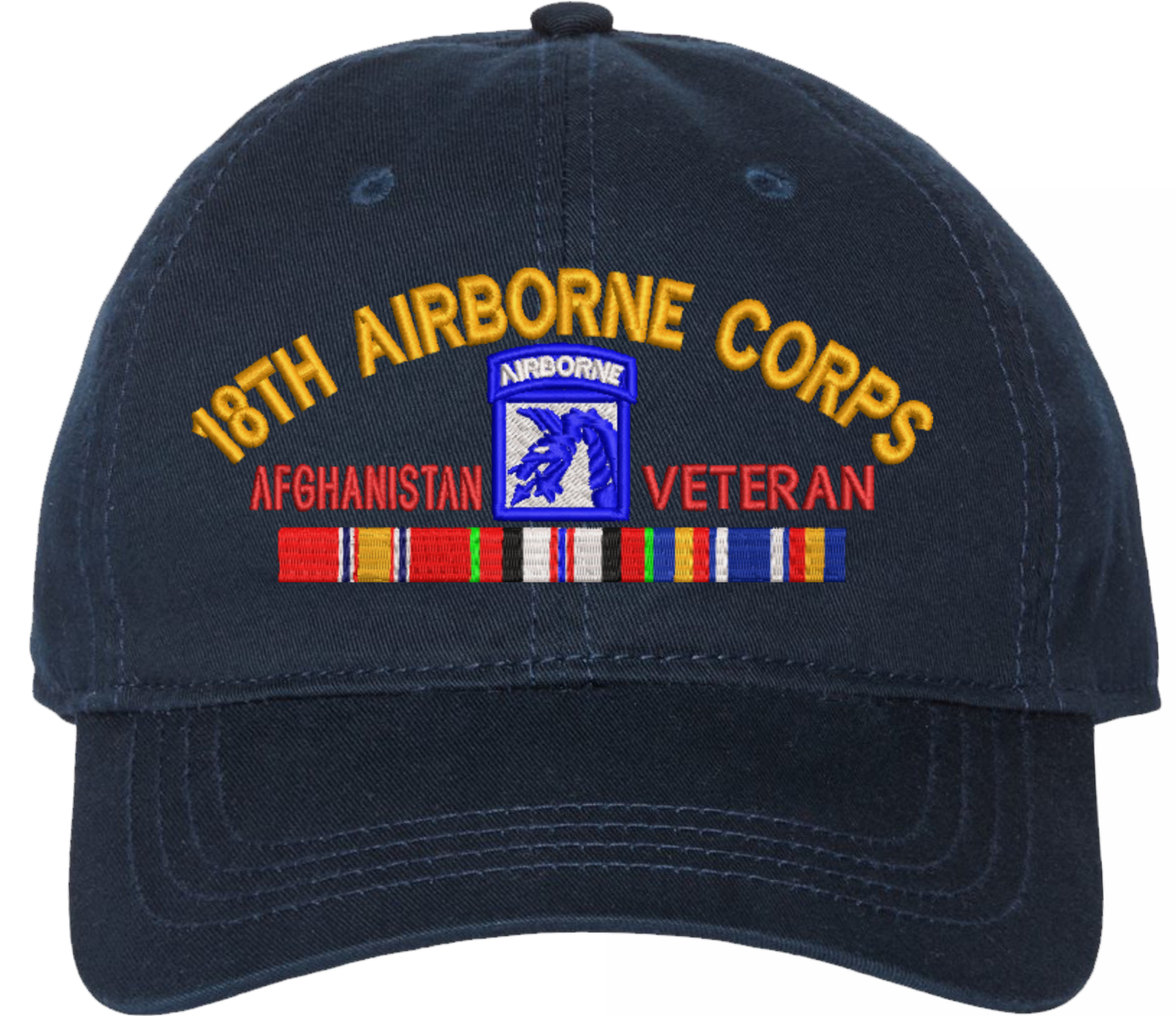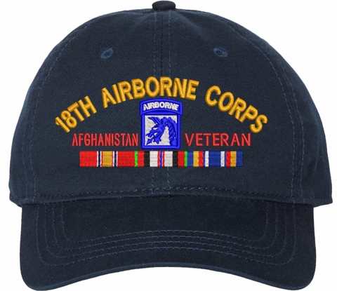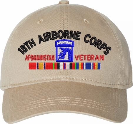 Show your Army pride with this XVIII Airborne Corps Afghanistan Veteran with Ribbons Unstructured Dad Cap from MilitaryBest. Crafted from 100% washed chino twill cotton, this six-panel, low-profile cap offers a relaxed and comfortable fit. Featuring high-quality embroidery done in our Scottsboro, Alabama facility, this cap is designed with a pre-curved visor and an adjustable tri-glide buckle closure for a perfect fit. Whether for everyday wear or as a meaningful gift, this cap is a great way to honor your own or a loved one's service.For caps ordered with custom embroidered personalized text please allow an additional 3 to 5 days production time. All custom back text will be embroidered in ALL CAPITAL LETTERS. Caps with back text or eggs are non-returnable unless there is a material defect in the cap.