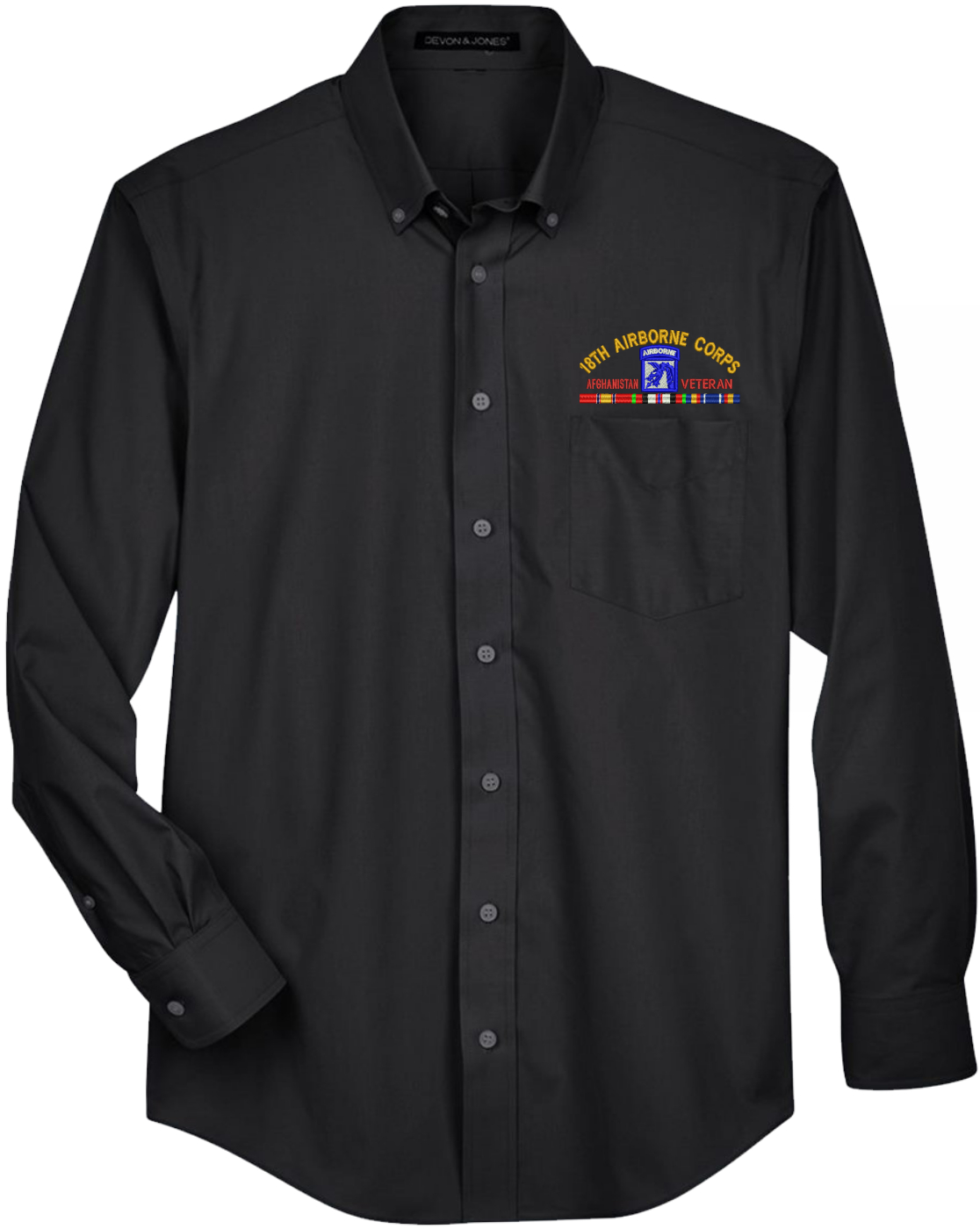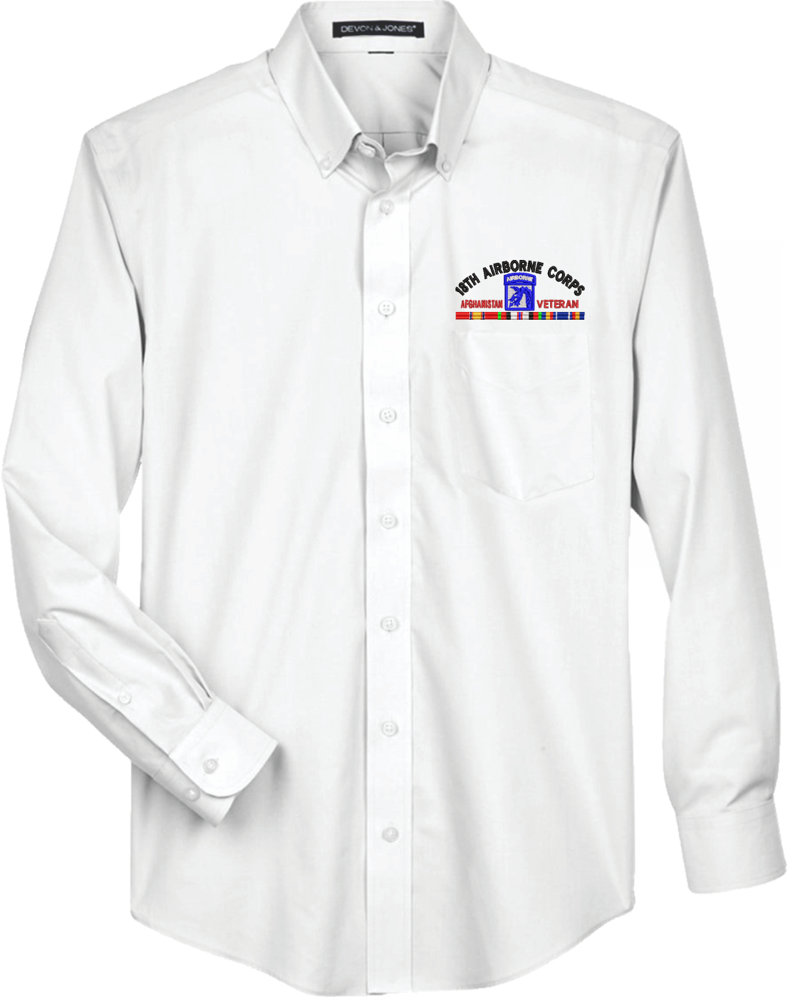 MilitaryBest has expanded its line of apparel with this XVIII Airborne Corps Afghanistan Veteran with Ribbons Embroidered Dress Shirt. This long sleeve button down dress shirt is made using a stain-release, wrinkle-free, 55% cotton/45% polyester material. The pocket over the left chest measures 4 3/4" across. Featuring a XVIII Airborne Corps Afghanistan Veteran with Ribbons design above the pocket, this shirt is embroidered to order at our facilities in Scottsboro, AL..- 55% cotton/45% polyester
