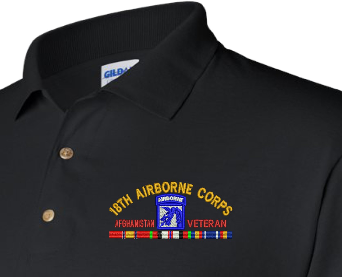 MilitaryBest is proud to offer this quality U.S. Army XVIII Airborne Corps Afghanistan Veteran with Ribbons Embroidered Polo. Each Polo is available in either 100% Ringspun cotton pique or a 50/50 cotton/polyester blend. These quality Military Polos are proudly embroidered at our facilities in Scottsboro, AL. Support the Army MWR program by purchasing only from Licensed Vendors.