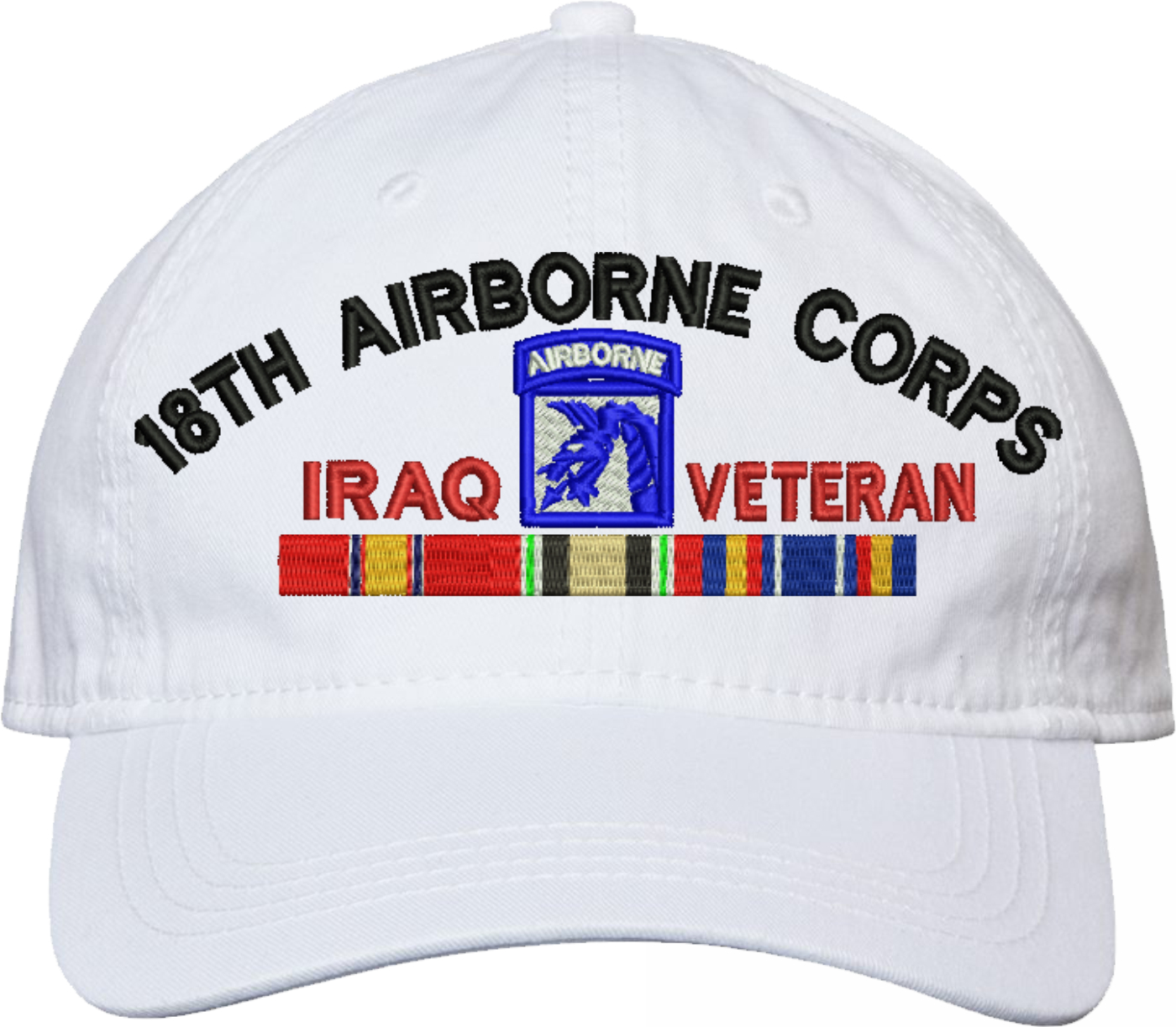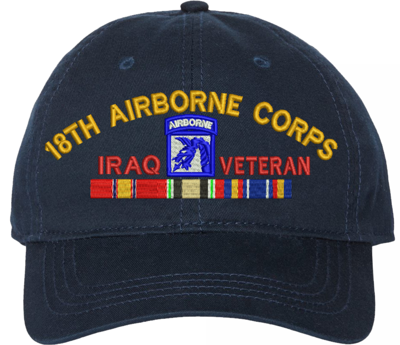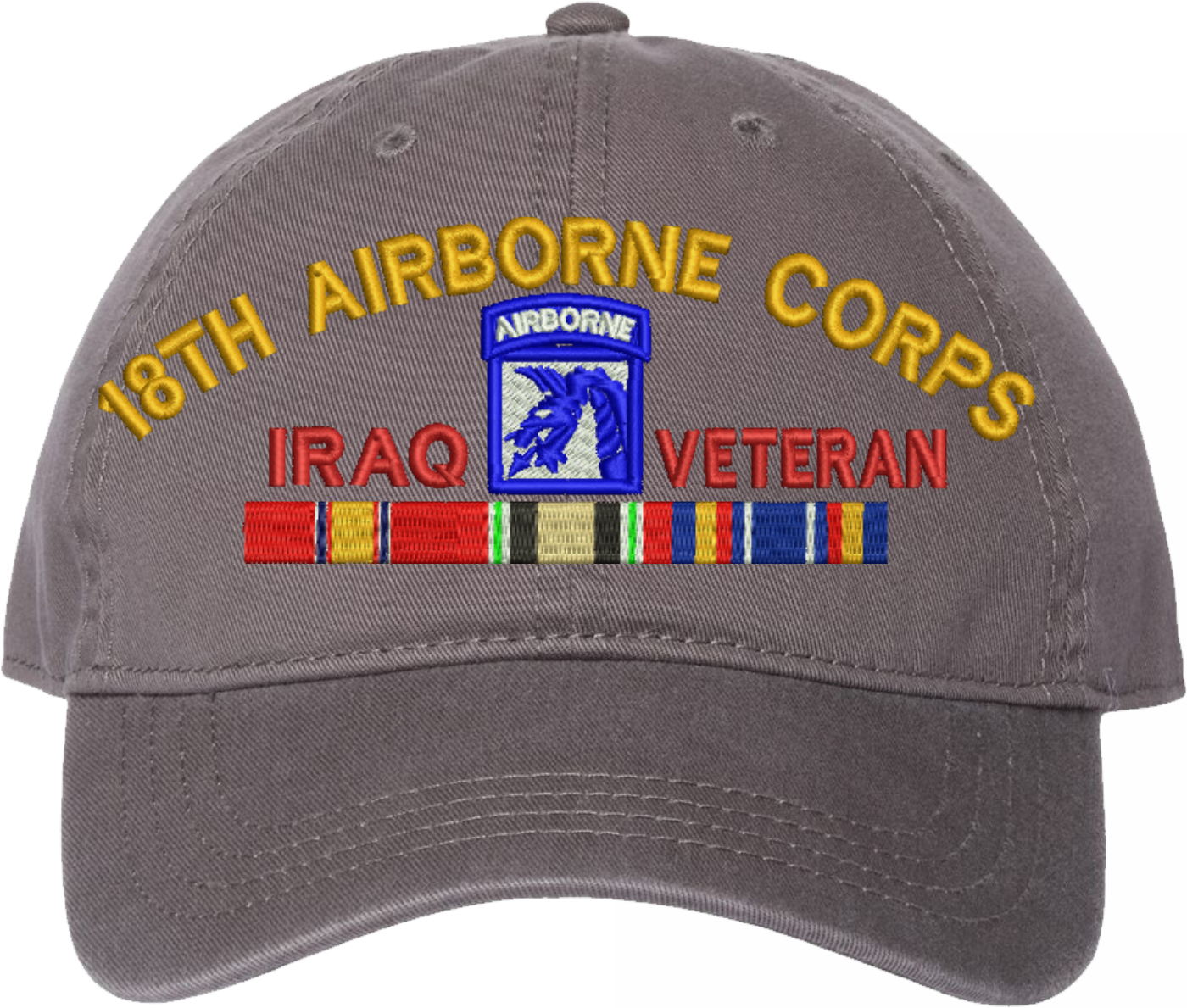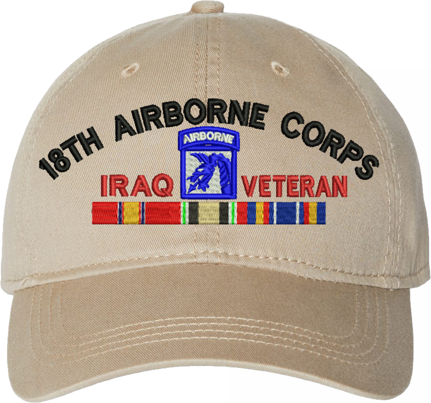 Show your Army pride with this XVIII Airborne Corps Iraq Veteran with Ribbons Unstructured Dad Cap from MilitaryBest. Crafted from 100% washed chino twill cotton, this six-panel, low-profile cap offers a relaxed and comfortable fit. Featuring high-quality embroidery done in our Scottsboro, Alabama facility, this cap is designed with a pre-curved visor and an adjustable tri-glide buckle closure for a perfect fit. Whether for everyday wear or as a meaningful gift, this cap is a great way to honor your own or a loved one's service.For caps ordered with custom embroidered personalized text please allow an additional 3 to 5 days production time. All custom back text will be embroidered in ALL CAPITAL LETTERS. Caps with back text or eggs are non-returnable unless there is a material defect in the cap.